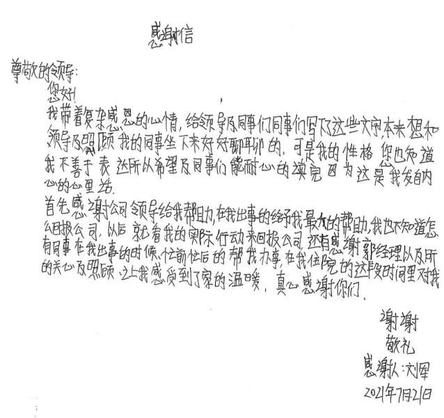 经过半个月治疗休养,刘军手部已无大碍。出院后的他写了一封感谢信并为公司送了一面锦旗,他说道,是金年汇官方版网站登录入口-金年汇(中国)这个大家庭让他感受到了关怀和温暖,他表示要把这种关怀变成工作上的动力,争取早日返回工作岗位,努力工作,回报大家的关心和关爱。
